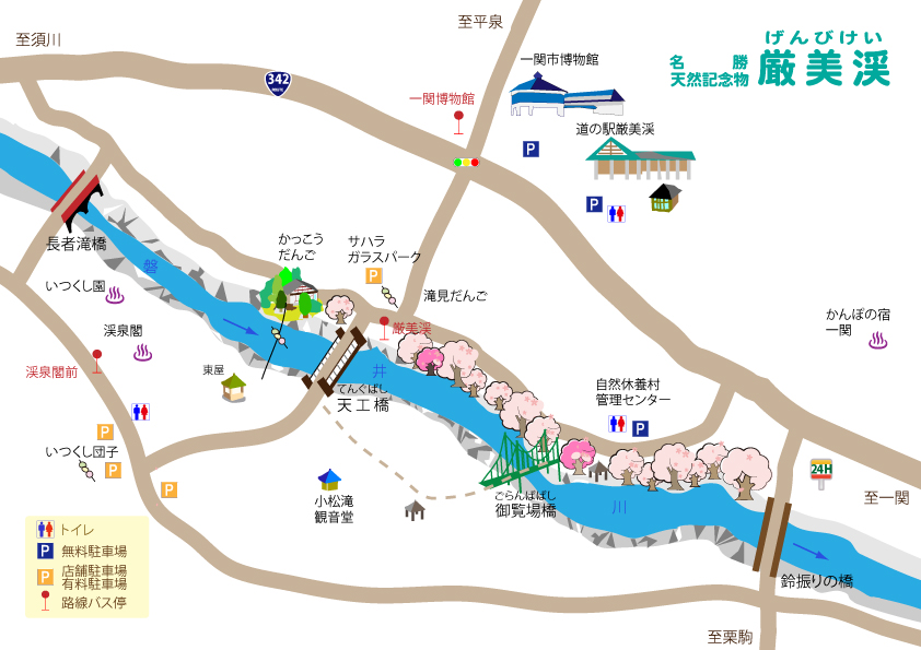 [東北自動車道]浦和IC⇔一関IC 約5H(444.5km) ⇔厳美渓 10分 [東北自動車道]仙台宮城IC⇔ 一関IC約1H10分(99.4km) ⇔厳美渓 10分 [東北自動車道]盛岡IC⇔ 一関IC 約50分(80.3km) ⇔厳美渓 10分 [東北自動車道]一関IC⇔ 一関IC 約9分(11.5km) ⇔厳美渓 10分 [東北自動車道]秋田中央IC⇔ 一関IC約1.7H(143.7km) ⇔厳美渓 10分 ~一関駅までの所要時間